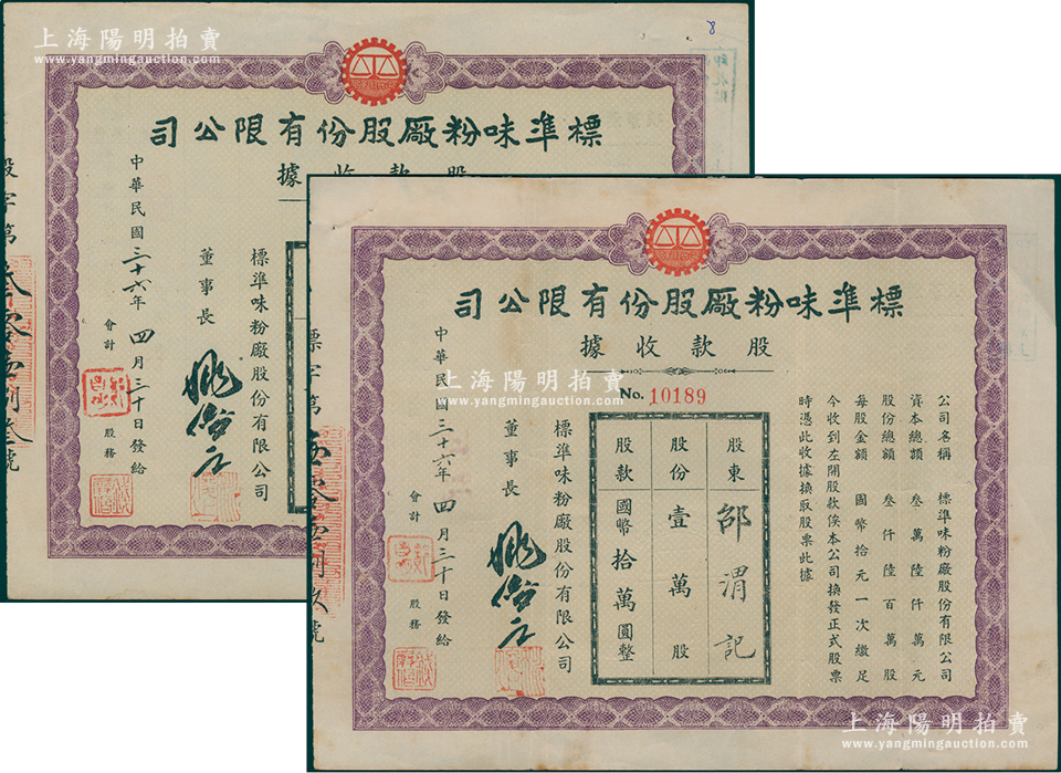 民国三十六年(1947年)标准味粉厂股份有限公司股款收据共2种全套,详分:手填式贰仟股计国币贰万圆、定额壹万股计国币拾万圆,此乃老上海著名味精厂,以生产久味一、鲜大王味精而著称;其中定额壹万股存世少见,且属首度公诸于阳明,八至九成新