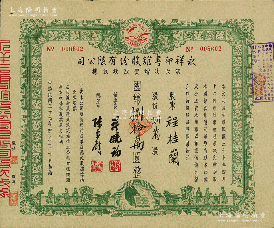 民国三十七年(1948年)永祥印书馆股份有限公司第六次增资股款收据,捌万股计国币捌拾万圆,票上印有“文化之光”和孔子周游列国图等,设计极富传统内涵;八成新