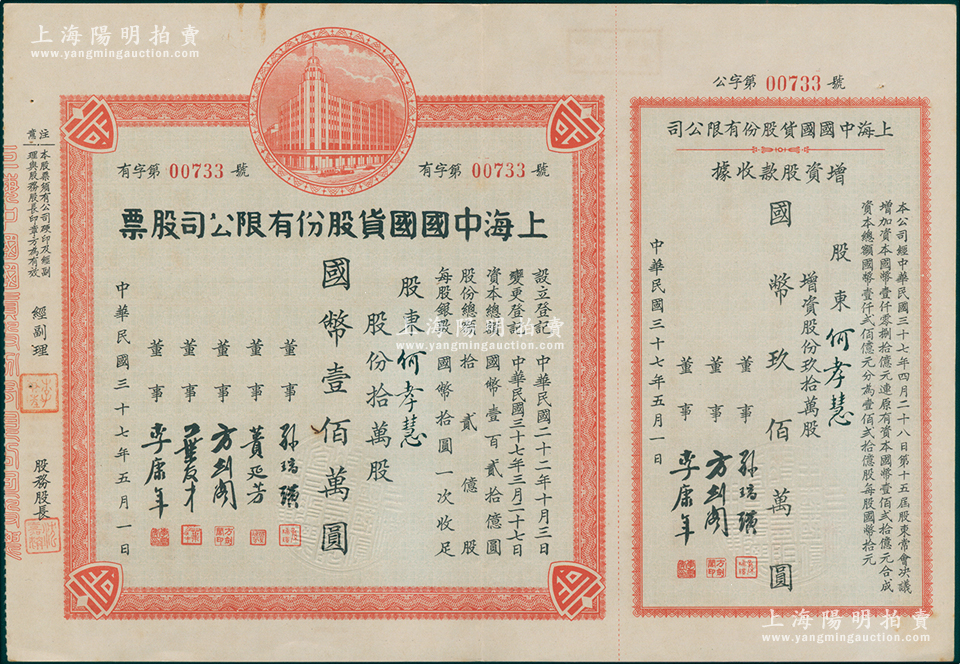 民国三十七年(1948年)上海中国国货股份有限公司股票,拾万股计国币壹佰万圆,右侧附带增资股款收据玖拾万股;此为民国著名的国货企业,票上董事蒉延芳、方剑阁、李康年等均为旅沪宁波籍工商业巨子;少见,八成新