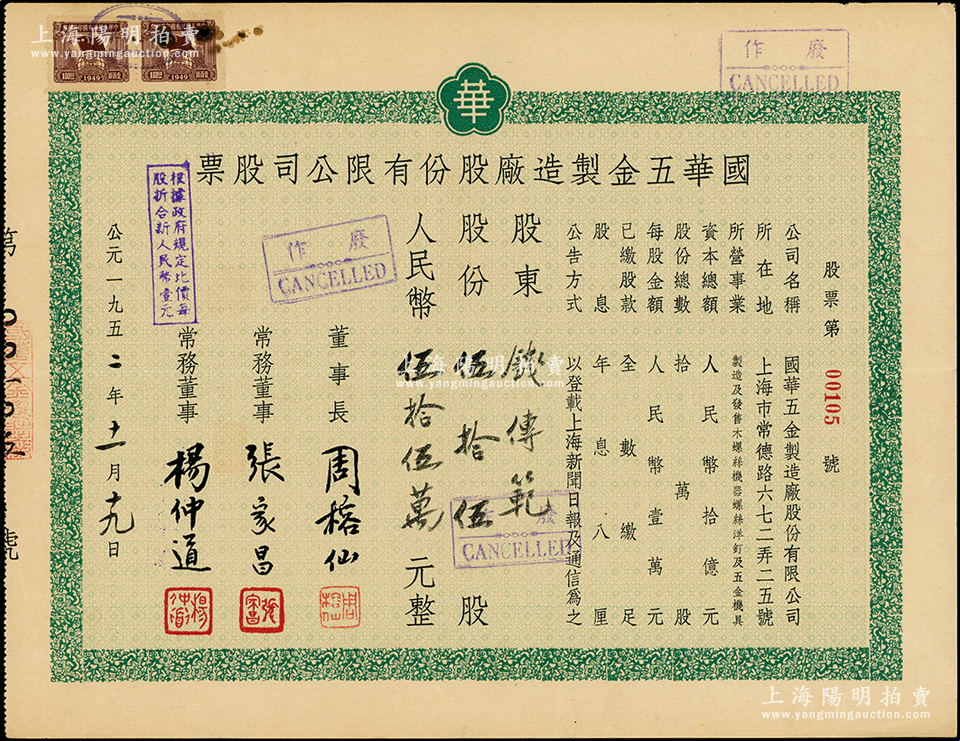 1952年国华五金制造厂股份有限公司股票,伍拾伍股计人民币伍拾伍万元;该公司址设上海常德路,主营制造及发售五金机具等;少见,八成新