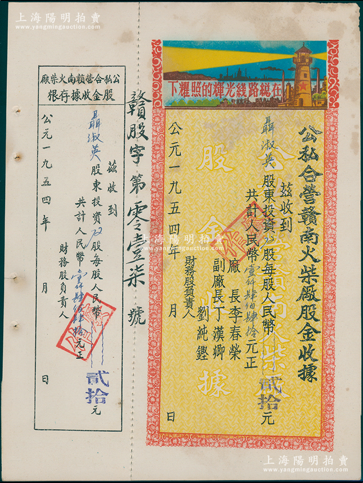 1954年公私合营赣南火柴厂股金收据,72股计人民币壹仟肆佰肆拾元,印有“在总路线光辉的照耀下”口号及图案,极富时代特色,近八成新