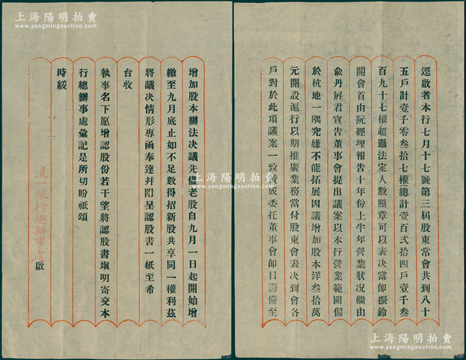民国早期(杭州)道一银行总办事处致股东公函1通共2页,事为“股东常会提案增加股本洋30万元,开设沪行及增认股份”等情;该行属浙江著名商业银行,成立于1919年,址设杭州太平坊,至1922年设上海分行,1932年受淞沪抗战影响而歇业;陈伟国先生藏品,附带原信封,八成新