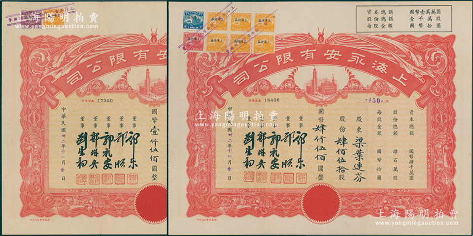民国卅二年(1943年)上海永安有限公司股票共2张,面额分别为壹佰伍拾股计国币壹仟伍佰圆、肆佰伍拾股计国币肆仟伍佰圆;陈伟国先生藏品,八至九成新
