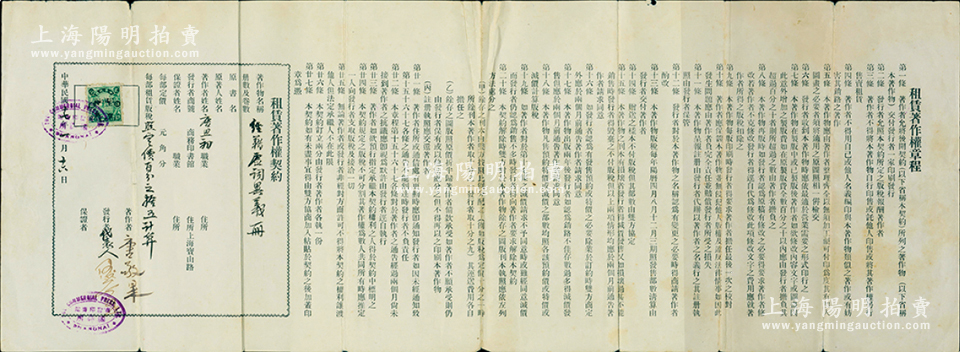 民国十七年(1928年)上海商务印书馆“租赁著作权契约”1份,由商务印书馆与《经籍虚词异议》作者唐旦初所签订,约定每部租赁版税照定价15%计算,其上并印有“租赁著作权章程”;此种民国时期出版书籍之版税合约,存世罕见,且富史料研究价值;陈伟国先生藏品,八成新