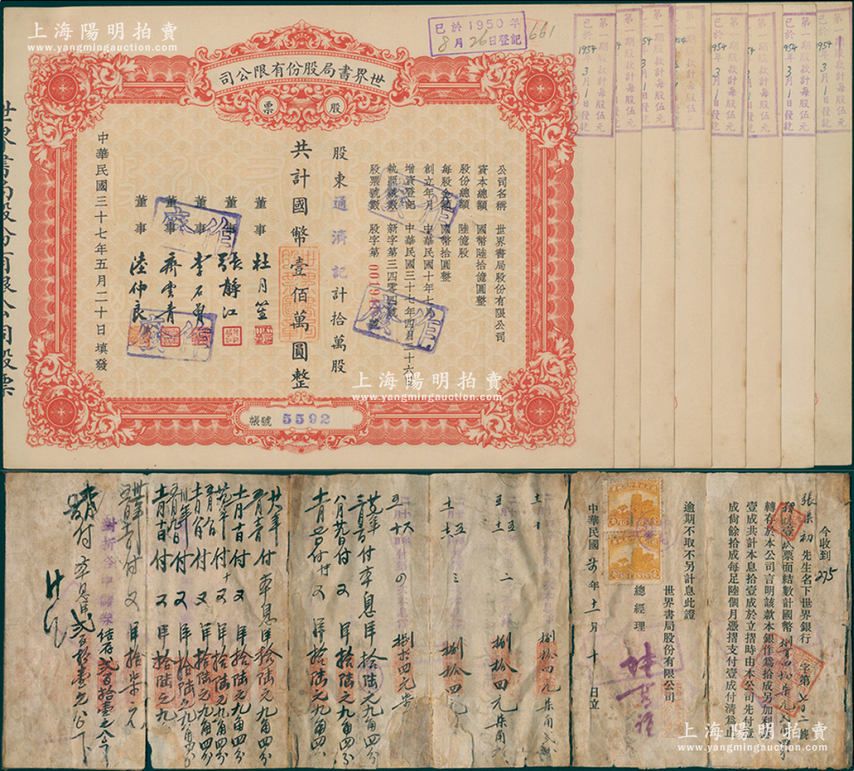 民国三十七年(1948年)世界书局股份有限公司股票共8张,均为拾万股计国币壹佰万圆,其票上所印董事有上海滩大亨杜月笙、国民党元老张静初、李石曾等;陈伟国先生藏品,九五成新(另附:1935年世界书局股份有限公司存摺1册,实属该局所办世界银行之存摺)