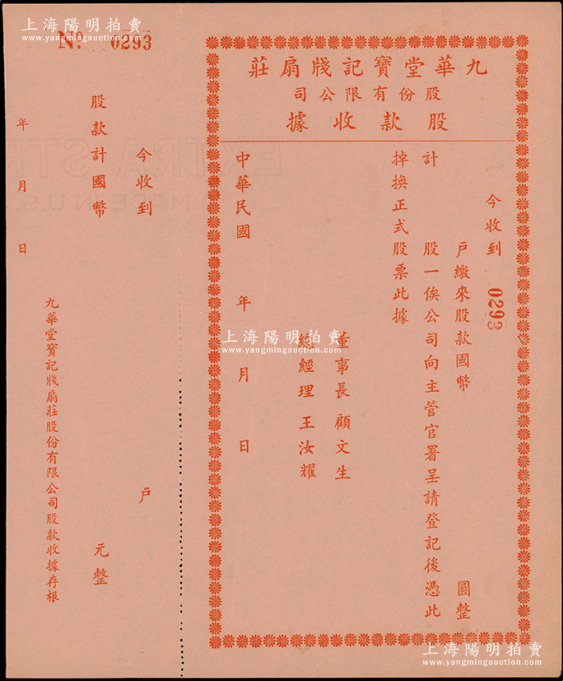 民国年(上海)九华堂宝记牋扇庄股份有限公司股款收据,未填用附存根,属上海老字号;陈伟国先生藏品,内有水印,九成新
