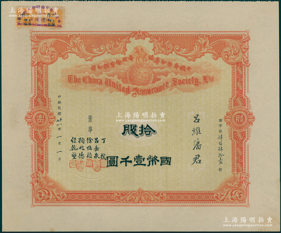 民国廿一年(1932年)中国华安合群保寿股份有限公司股票,拾股计国币壹千圆,由董事徐绍桢(辛亥革命开国元勋)、总经理吕岳泉等署名;该公司成立於1912年,由“寿险大王”吕岳泉发起创立,属近代中国第一家且规模最大的专营人寿保险的民族资本保险公司;陈伟国先生藏品,少见,九成新