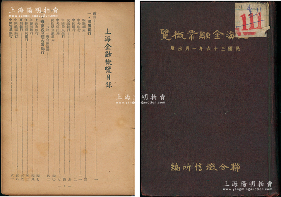民国三十六年(1947年)联合征信所编《上海金融业概览》1册,32开精装本厚530余页,内中收录老上海200余家国家银行、省市及官商合营银行、商业银行、外商银行、钱庄、信托公司、保险公司、票据交换所、证券交易所等之简史、资本、负责人、地址、存款及盈余等,内容极为详尽,堪称研究老上海银行史之经典;陈伟国先生藏品,罕见,保存较佳,敬请预览