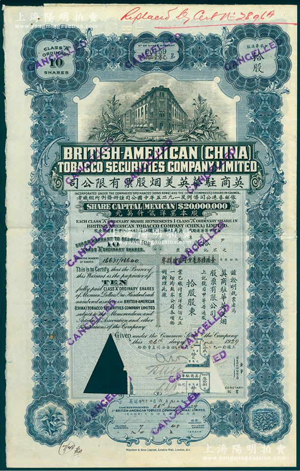 1929年英商驻华英美烟股票有限公司股票,甲等普通股拾股计墨洋壹佰元,注销票(票上有二注销孔);陈伟国先生藏品,罕见品,七成新
