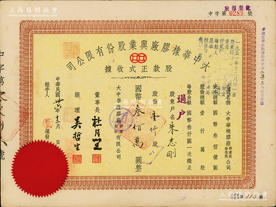 民国卅六年(1947年)大中华橡胶厂兴业股份有限公司股款正式收据,壹仟股计国币叁佰万圆,票上有上海大亨杜月笙等人签名,背面付息状况至1966年;陈伟国先生藏品,好品相少见,八成新