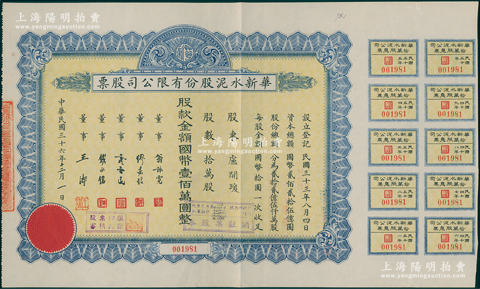 民国三十六年(1947年)华新水泥股份有限公司股票,拾万股计国币壹佰万圆,附带有息票;这是中国最早的水泥厂,创办于清代1907年,迄今为上市公司;陈伟国先生藏品,九成新