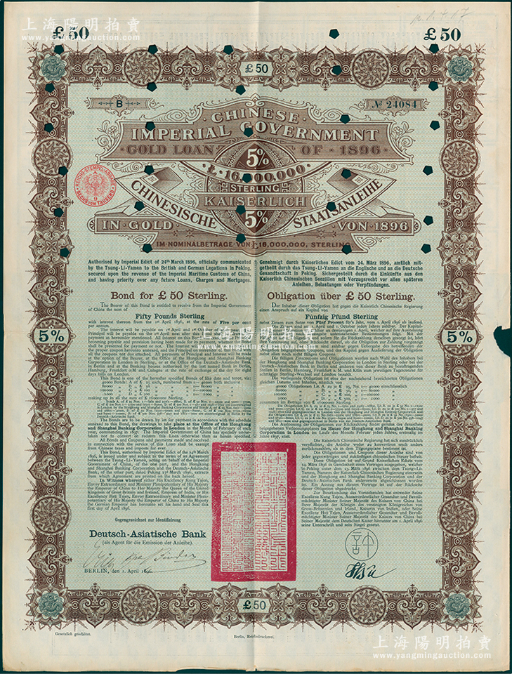 1896年大清中华帝国政府英德借款金债券50镑,由德华银行(Deutsch-Asiatische Bank)代理发行,驻德公使许景澄签章;海外藏家出品,满版水印,八成新