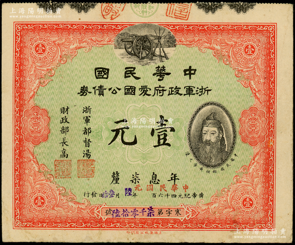 黄帝纪元改民国元年(1912年)中华民国浙军政府爱国公债券壹元,上印中华民族始祖黄帝之像,由浙军都督汤寿潜、财政部长高子白署名发行,背印公债简章;中国债券之大珍品,且属首度公诸于阳明,诚可遇而不可求也,近八成新,值得珍视和推重