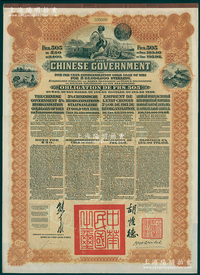 1913年中华民国政府向五国银行团善后大借款公债505法郎,由东方汇理银行(Banque de L'Indo-Chine in Paris)代理发行,棕色印刷,由北洋政府总理兼财政总长熊希龄、驻法公使胡惟德签署;海外回流品,九成新