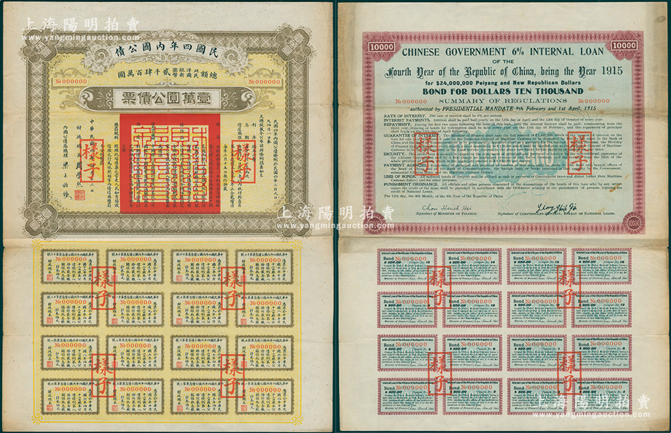 民国四年内国公债壹万圆公债票样子,由财政总长周学熙、内国公债局总理梁士诒签署,附带完整息票;此最大面额券存世珍罕,且属首度公诸于阳明,值得珍视和推介,八成新