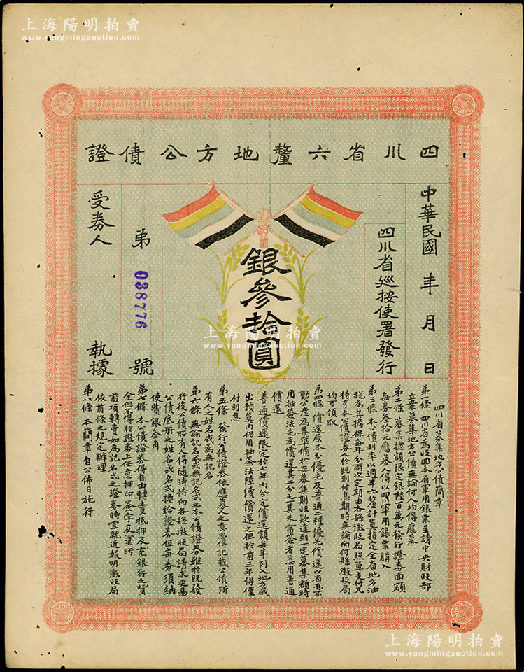 民国初年(约1914年)四川省六厘地方公债证·银叁拾圆,上印有五色旗,由四川巡按使署发行,用於回收四川大汉军用银票;少见,八五成新