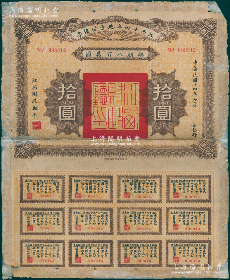 民国十四年(1925年)江西十四年地方公债票拾圆,附带完整息票;源于名家旧藏,属罕见品种,边有修补,近七成新