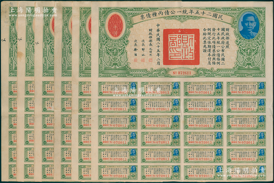 民国二十五年统一公债丙种债票千圆共6张,均附带有息票;台湾藏家出品,八成新