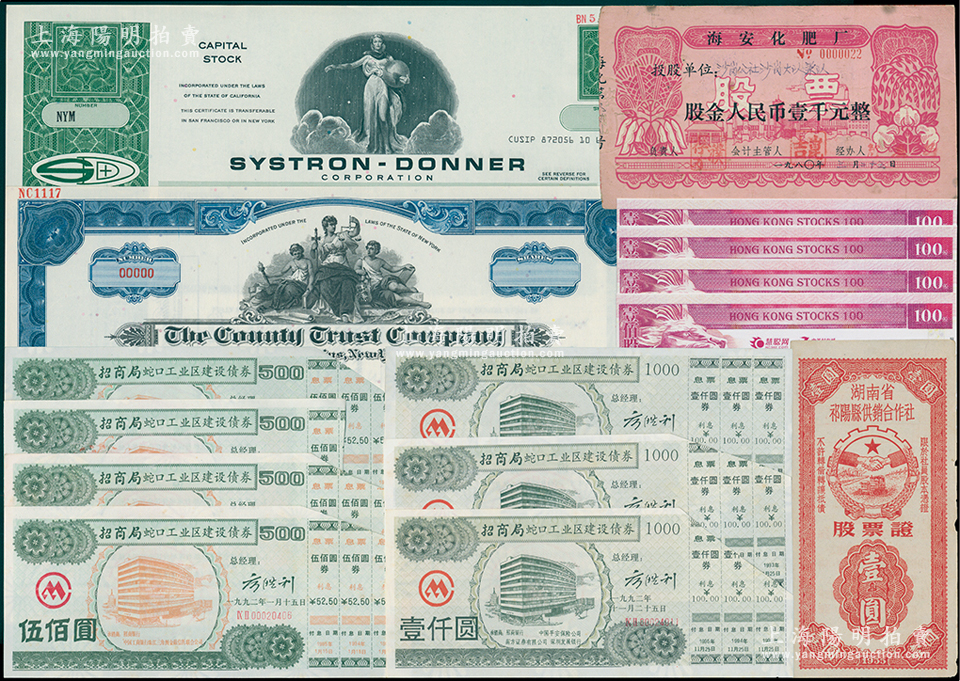 新中国股票债券一组共15枚,详分:1955年湖南省祁阳县供销合作社股票壹圆;1980年海安化肥厂股票壹千元;1992年招商局蛇口工业区建设债券伍佰圆4枚、壹仟圆3枚;2016年慧聪亲友网100股4枚;(美国)县信托公司、1978年Systron-Donner集团股票样本2种;八成至全新