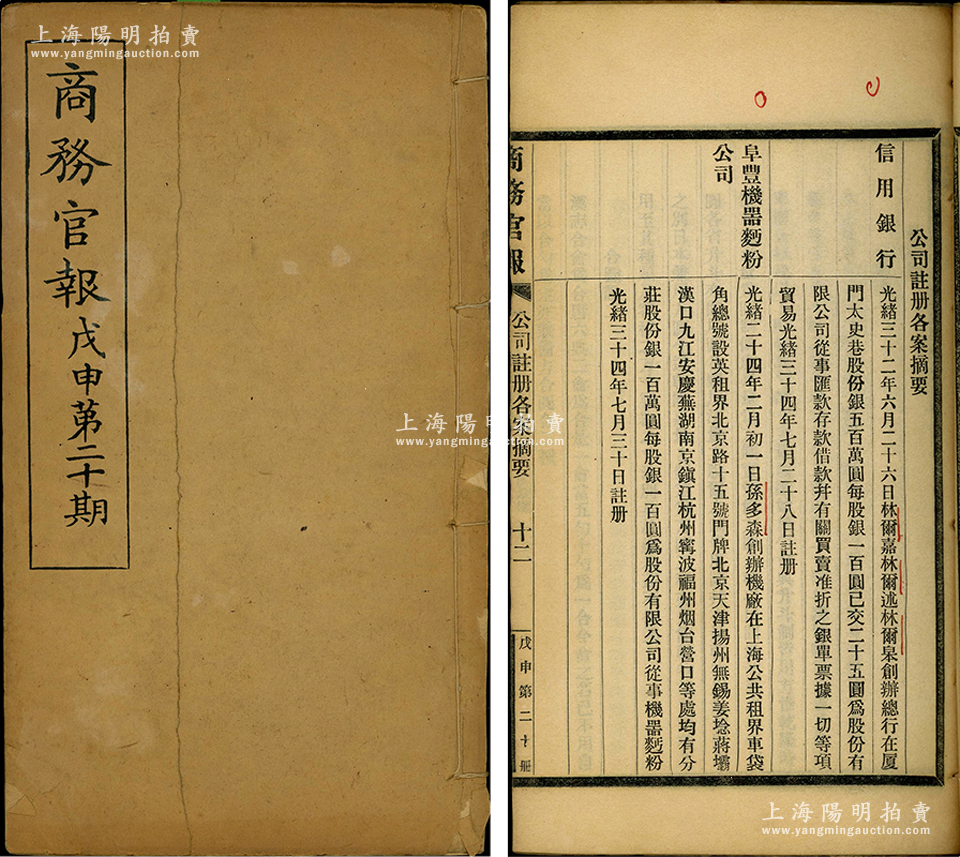 光绪三十四年(1908年)《商务官报》戊申第二十期1册,该报由大清政府农工商部所创办,内中记录有“万国博览会之效果”、“奏筹议华商创兴琼崖地利摺”、“陈宜禧禀新宁铁路与粤路公司筹商增筑江门支路”及批准厦门“信用银行”、“阜丰机器面粉公司”(该公司发行有老股票存世)等注册之详情,对研究清末股票史极富裨益;保存甚佳,敬请预览