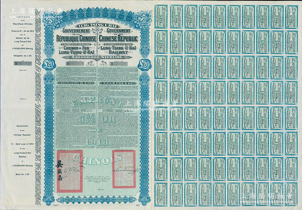1913年中国政府对外发行督办陇秦豫海铁路公债20英镑库存备份票,用于债券持有人丢失后补换,据高文著《中国对外债券》一书记载其发行量仅1410张;海外藏家出品,特大型,附带有完整息票,九成新