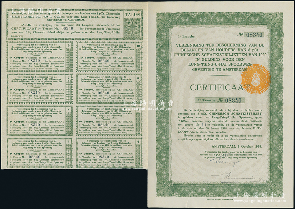 1928年陇秦豫海铁路荷兰债权第一期凭证1000荷兰盾,绿色附带有息票;当时由于中国政府违约,停止支付1920年和1923年发行的荷兰陇秦豫海铁路债券,荷兰债权团针对违约债券发行了专门的债权凭证;海外藏家出品,少见,八成新