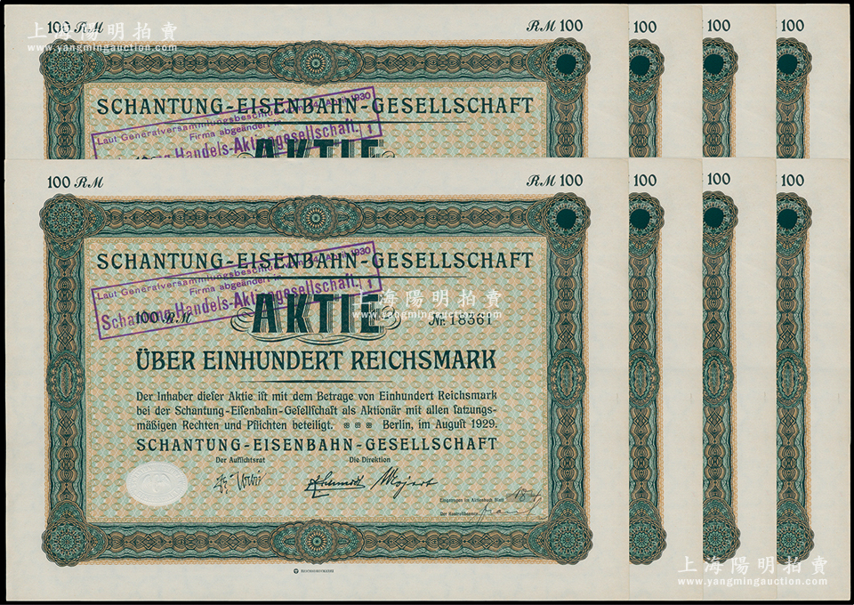 1929年山东胶济铁路公司股票共8张连号,面额均为1股计100马克,票上有满版水印;该公司由原德国占领青岛的殖民地政府所倡办,总部设于青岛;德国藏家出品,少见,九成新