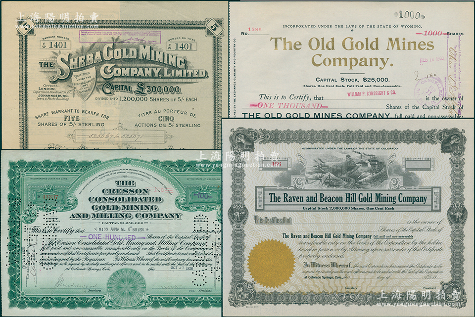 【华工淘金史】清末民初金矿老股票4种,详分:1903年老金矿公司1000股,1912年示巴金矿公司股票5股,19xx年渡鸦与信标山金矿公司未填用,1928年克雷森联合黄金开采和选矿公司股票100股,均属“淘金”历史之见证;华侨藏家出品,少见,其中1枚右下角有缺损,七至九成新