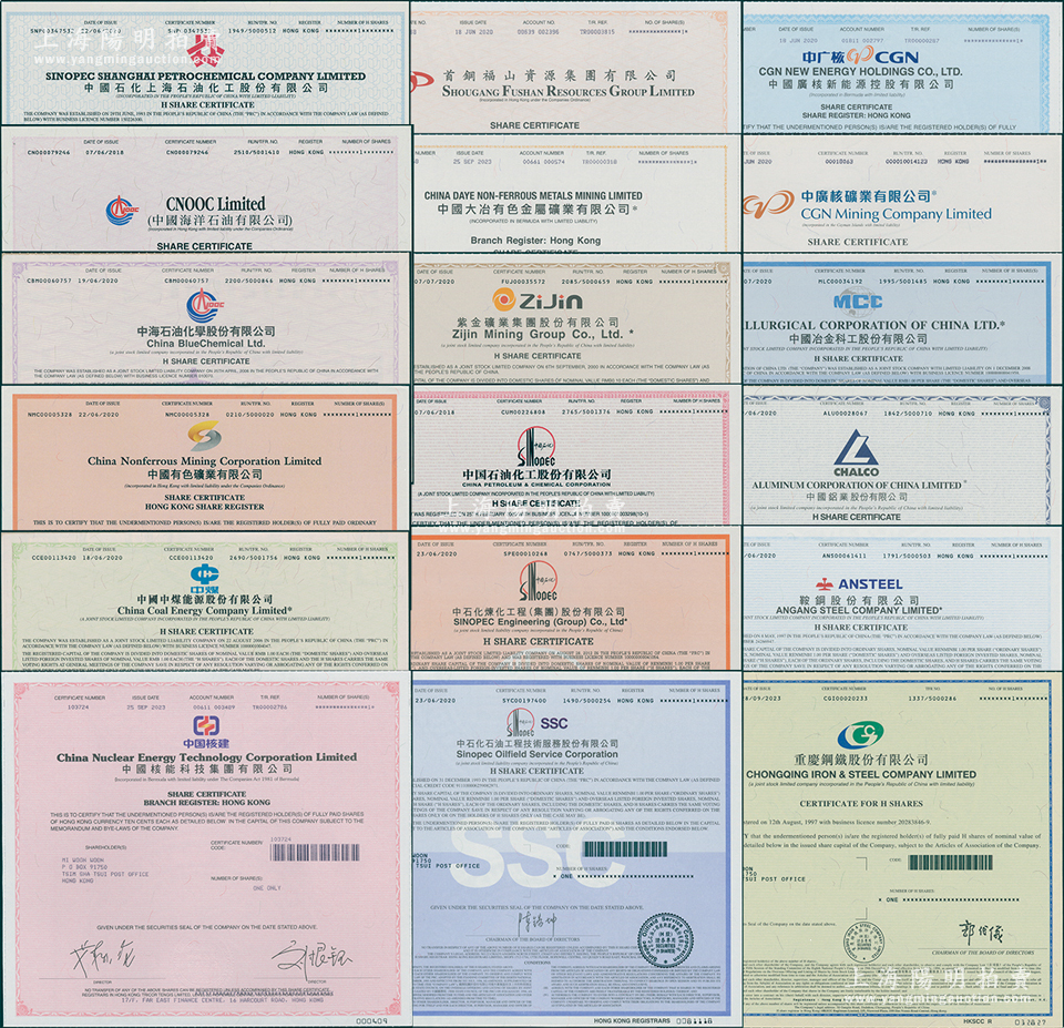 2018至2023年中国著名石油化工、能源冶金企业股票18种,详分:中国石油化工、中石化炼化工程(集团)、中石化石油工程技术服务、中国石化上海石油化工、中国海洋石油、中海石油化学、中国有色矿业、中国中煤能源、中国核建、中国广核新能源控股、中广核矿业、中国冶金科工、中国铝业、鞍钢股份、重庆钢铁、首钢福山资源集团、中国大冶有色金属矿业、紫金矿业集团,面额均为1股,内有水印,属香港上