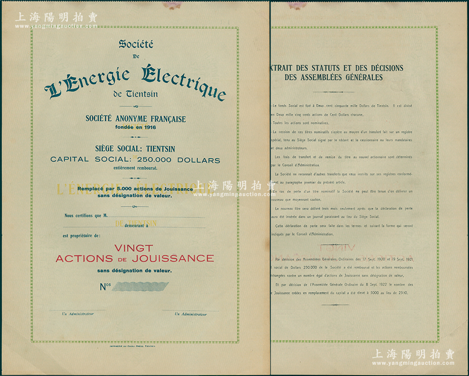 1916年天津法国电灯房股票,红利股20股,内有水印,背印条例文字,罕见,九成新