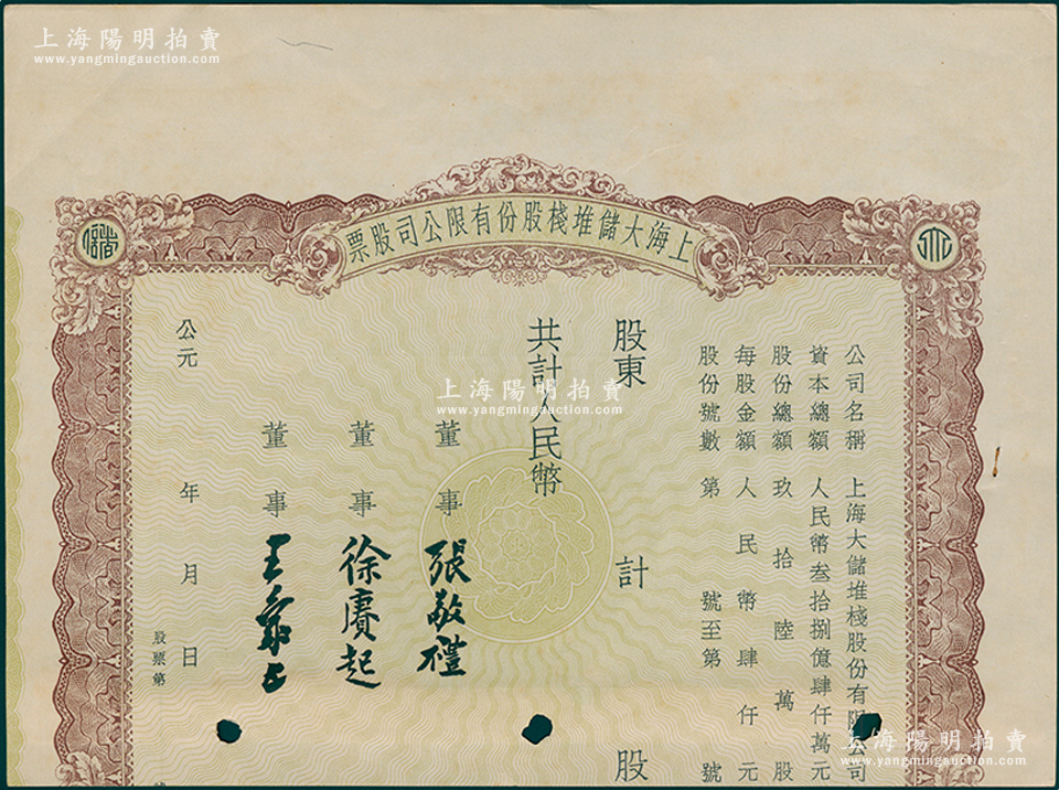 解放初(1950年代)上海大储堆栈股份有限公司股票,人民币未填用,票上由董事张敬礼(南通人,清末状元张謇之侄,张氏家业掌门人)、徐赓起(南通第一位留美学生,淮海实业银行协理)、王象五(南通名流王佐清堂侄)署名,该堆栈与大通、大达轮船公司有关,对接南通天生港码头;少见且属首度公诸于阳明,唯惜下边有缺失,七五成新