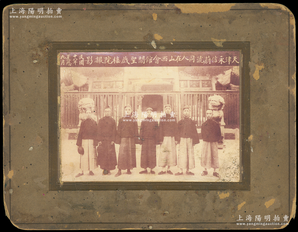 民国十八年夏历九月(1929年)“天津永信蔚号同人在山西会馆关圣戏楼院撮影”历史老照片1张,原装帧,带框尺寸220×170mm;胡俊良先生藏品,此种山西票号(银号)业老照片存世罕见,可适用于展览或典藏;保存较佳,敬请预览