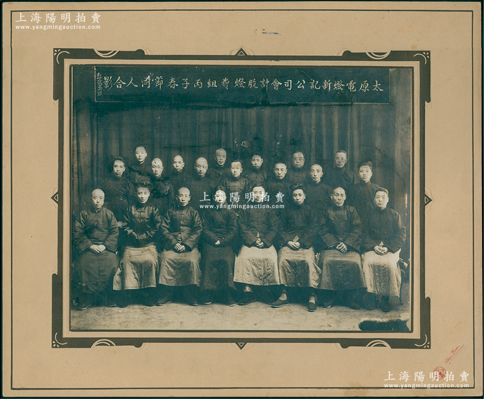 1936年“太原电灯新记公司会计股灯费组丙子春节同人合影”特大型历史老照片1张,原装帧,带框尺寸385×315mm,由山西三元像馆摄制;胡俊良先生藏品,罕见,可适用于展览或典藏,保存甚佳,敬请预览