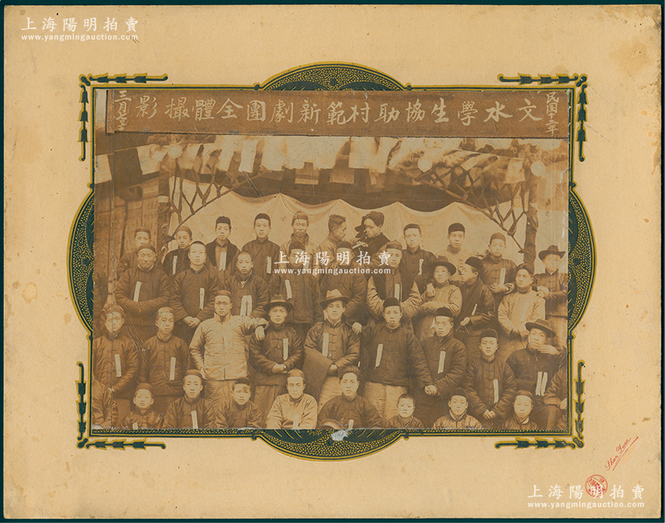 民国十二年三月七号(1923年)“文水学生协助村范新剧团全体撮影”大型历史老照片1张,原装帧,带框尺寸302×235mm,由山西三元像馆摄制;胡俊良先生藏品,罕见,可适用于展览或典藏,保存较佳,敬请预览