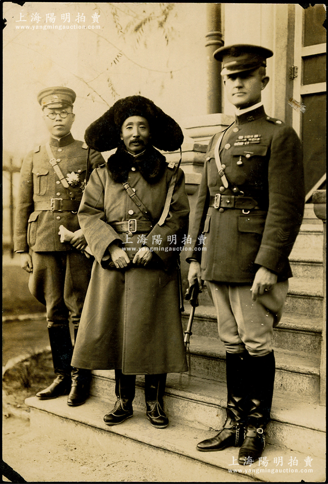 北洋政府奉系军阀领袖、安国军总司令“张作霖视察天津美国海军陆战队时的合影”历史老照片1张,尺寸85×134mm,摄于1926年,当时张作霖在访问美国驻天津领事馆期间,应邀视察美国海军陆战队时留下的合影,右边美军军官可能是史迪威(未找到史迪威将军的年青像,但与他的儿子小史迪威照片很像);少见且保存甚佳,值得预览和重视