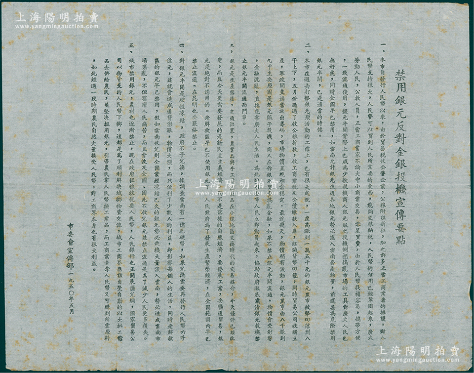 1950年(上海)市委会宣传部“禁用银元反对金银投机宣传要点”传单1份,其上内容丰富,保存较佳,敬请预览