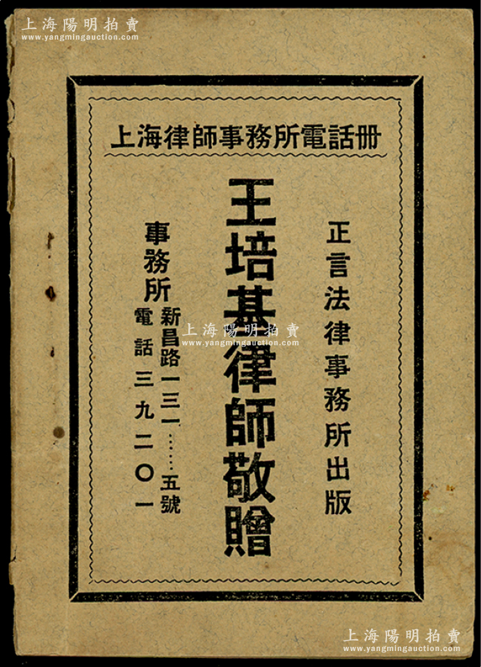 民国卅六年(1947年)正言法律事务所出版《上海律师事务所电话册》一小册,封面印有“王培基律师敬赠”字样,内中录有老上海1000多位律师的姓名、地址和电话号码(包括史良、沈钧儒、沙千里、章士钊等诸多名人),且含法院、监狱、警察局等信息;俞建国律师藏品,罕见,保存较佳,敬请预览和珍视