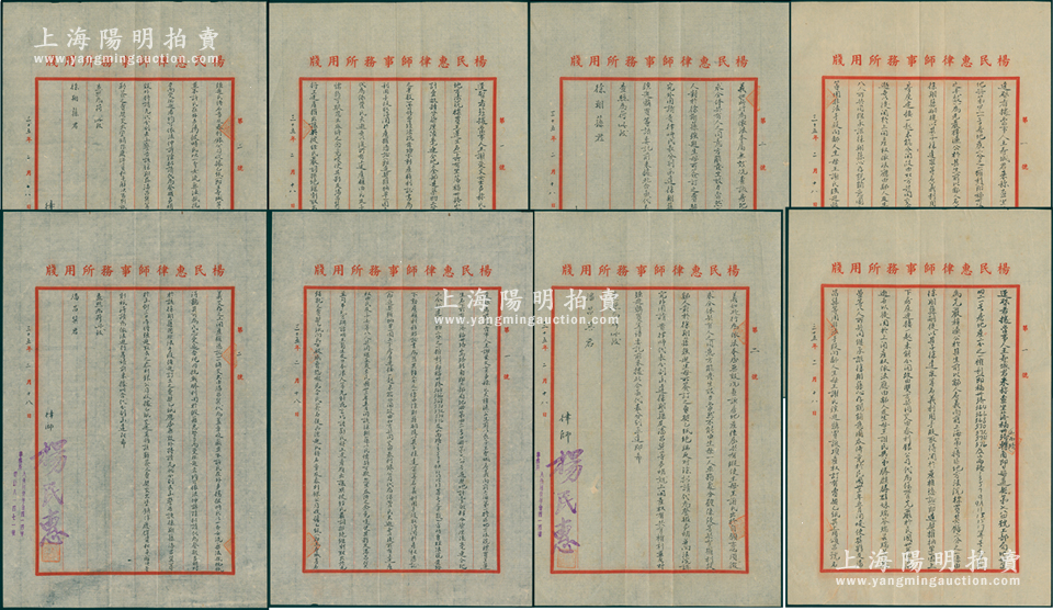 民国卅五年(1946年)上海“杨民惠律师事务所”致徐翔荪君(上海华美药房经理)、潘昌巽君律师函共4通各2页(合计8页),其内容丰富、连贯精彩,事为“据当事人王寿城、王谢爱文委称,先严(或夫)曾向上海第一特区法院标卖福州路、山西路转角地块,至1944年间徐翔荪、潘昌巽等用非法手段向鄙人生母强迫购买”等情,由律师杨民惠签名盖印;俞建国律师藏品,保存甚佳,敬请预览