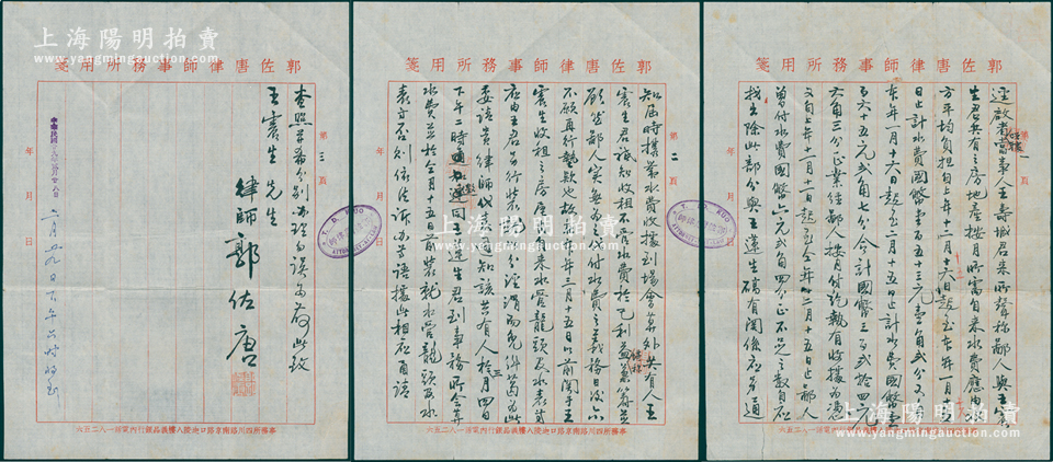 民国廿九年(1940年)上海“郭佐唐律师事务所”致王震生先生律师函1通共3页,事为“共有房地产之水费纠纷”等情,由律师郭佐唐签名盖印;俞建国律师藏品,内容丰富,保存较佳,敬请预览