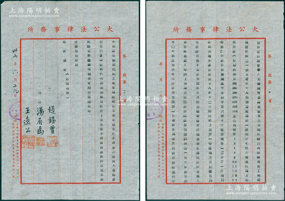 民国卅七年(1948年)上海“大公法律事务所”致徐翔荪先生(上海华美药房经理)律师函1通共2页,事为“当事人王寿城等委称,1939年12月时曾向上海第一特区法院标卖福州路、山西路转角地块且均有产证可凭,不料1944年间徐翔荪君以颂昌号名义向非所有权人承买,业经鄙人等向上海地方法院诉请确认该项契约无效,故函知”等情,由律师赵锡曾、汤有为、王逸公签名盖印;俞建国律师藏品,保存甚佳,