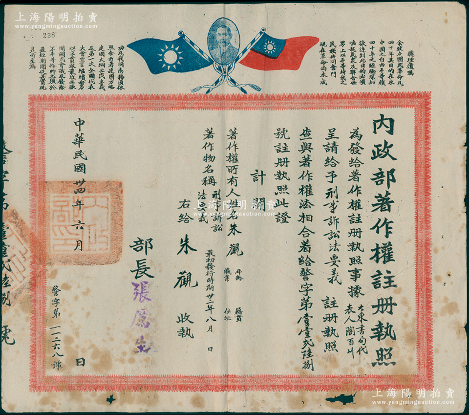民国卅四年(1945年)“内政部著作权注册执照”1份,由大东书局代表人陶百川呈请注册该书局出版的《刑事诉讼法要义》之著作权,由内政部长张厉生(国民党CC系骨干要员)签署,上印双旗、孙中山像和“总理遗嘱”;该书由法律学家朱观(陕西高等法院首席检查官兼西北大学法律系教授,另曾编有《县司法法令判解汇编》等)所撰写,此种著作权之证书存世罕见,值得珍视和推重,保存尚佳,敬请预览