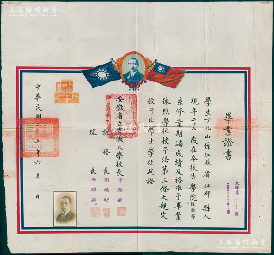 民国二十五年(1936年)“安徽省立安徽大学”毕业证书1份,特大型,发给江苏江都县学生丁兆山氏,证明其在本校“法学院经济学系毕业,授予法学士学位”,由校长李顺卿(著名植物学家)、教务长谢循初(心理学专家)、院长李顺卿签发;该校成立于1929年,首任校长刘文典,抗战时被迫内迁一度停办,1945年复校,迄今为安徽省最高学府;保存较佳,敬请预览
