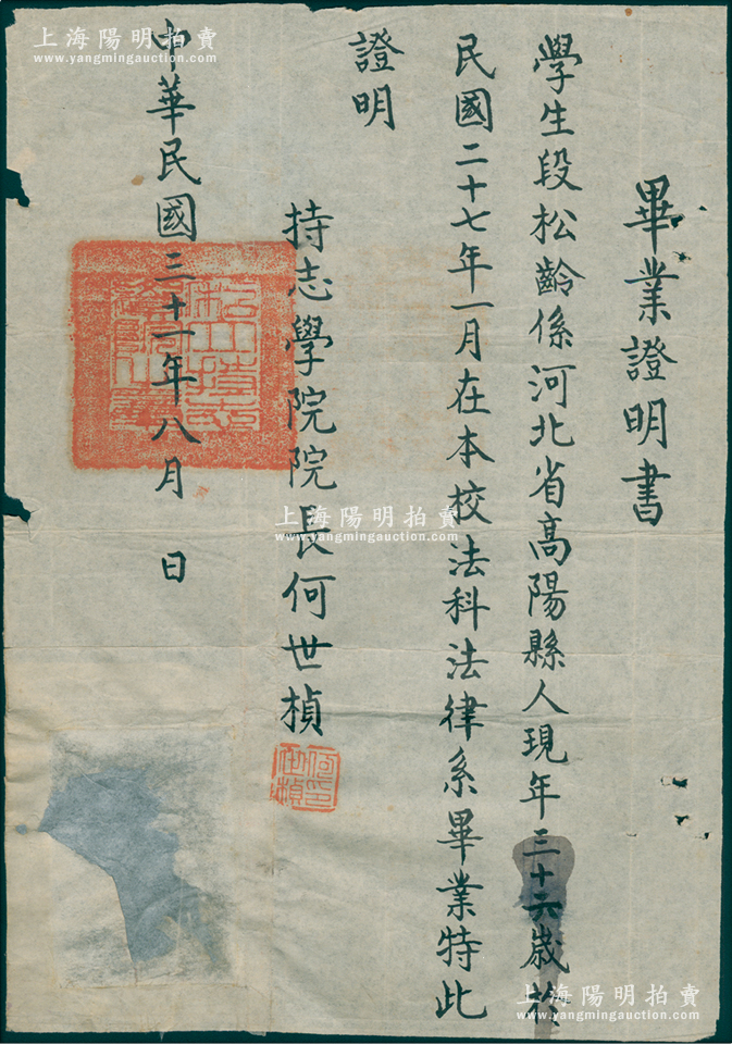 民国三十一年(1942年)上海“持志学院”毕业证明书1份,证明河北高阳县学生段松龄于1938年1月在本校“法科法律系”毕业,由院长何世桢(著名法学家、教育家)签发,时因抗战时期,该校已经停办,此毕业证乃何世桢应学生所需而临时手写,较为简陋;少见,保存较佳,敬请预览