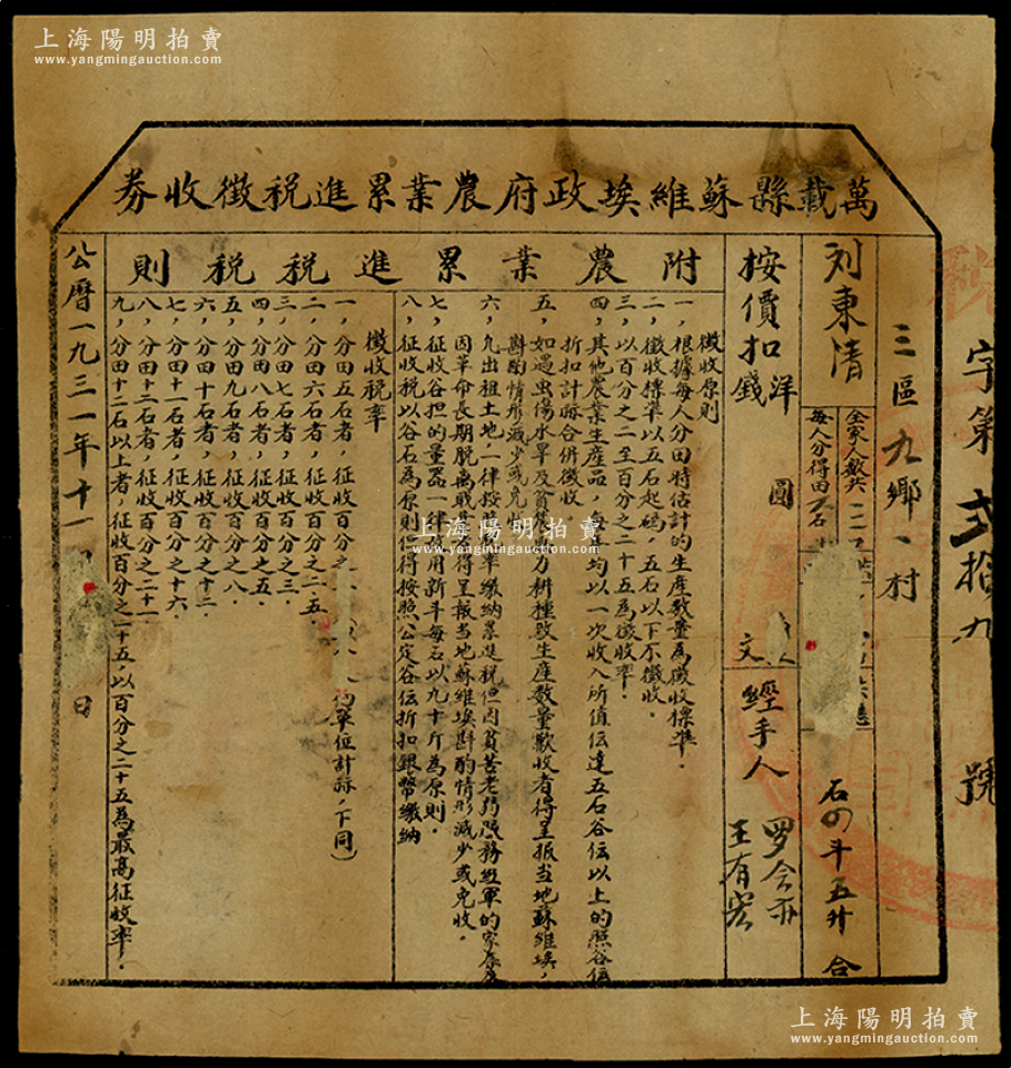 1931年“万载县苏维埃政府农业累进税征税券”1张,尺寸165×174mm,征收刘秉清税谷4斗5升,上印“附农业累进税税则”,骑缝处盖有苏维埃政府大圆章;此乃红军时代之革命文物,对研究苏维埃政权之税收制度,不失为重要历史实证;源于藏家出品,背有贴补,七成新,敬请预览和珍视