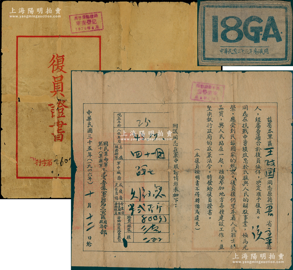 民国三十五年(1946年)国民革命军第十八集团军晋冀鲁豫军区第三军区司令部、政治部颁发之“复员证明”1份,发给山西高平籍战士王政国,且附民国三十五年度配用之“八路军布标”1枚;罕见,其中复员证明有贴补,布标保存较佳,敬请预览和重视