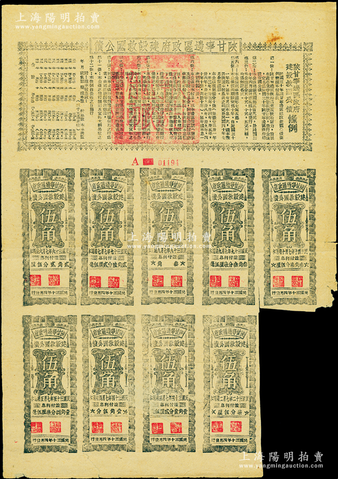 民国三十年(1941年)陕甘宁边区政府建设救国公债伍元,附带有伍角息票9枚,且息票上由革命元老林伯渠等盖章;资深藏家出品,八成新