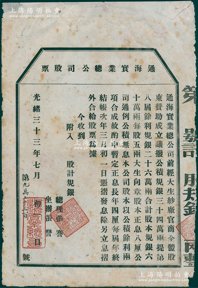 光绪三十三年(1907年)通海实业总公司股票,未填用,该公司由清末状元张謇昆仲所组织创办,七五成新