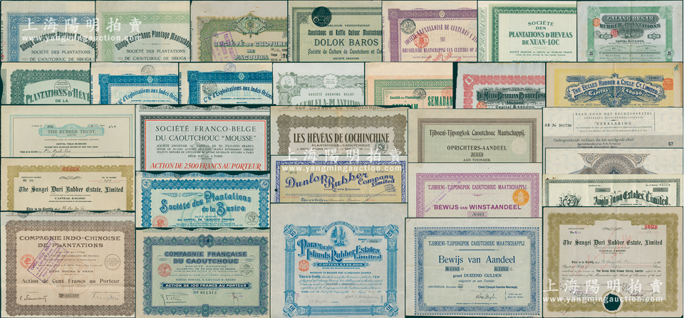 清末至民国时期“橡皮股票”藏品集一组共28种不同,详分:1898年埃克勒斯橡皮公司股票1股;1907年德梅洛橡皮公司5股;1910年(苏门答腊岛)多洛克·巴罗斯橡胶种植公司5股;(西苏门答腊)西博加橡胶种植园1910年优先股1股、5股;(爪哇岛)提博尼橡胶园1910年1股、1914年1股、1928年1股,附息票收据3张;1911年(爪哇)帕库达橡胶种植园1股、帕拉岛橡胶种植园10股;1912年加朗贝尔萨橡胶种植园25股;1913年苏门答腊橡胶种植园优先股1股、爪哇布鲁塞尔橡胶种植园紫色优先股1股;东印度种植公司1914年1股、1924年1股;1925年南圻橡胶公司股票100法郎;1927年(南圻)苏切雷橡胶种植园1股;1928年印支中国橡胶种植园股票1股计100法郎;1929年法国橡胶公司1股;布西拉橡胶种植园1930年普通股1股;春禄橡胶种植园1股计5000法郎;法比慕斯橡皮公司1股;1941年上海橡胶信托公司股票4股;1944年卢科莱拉种植园创始人股;1947年英商邓禄普橡胶公司股票100镑、英商爪哇地产(即橡胶园)公司股票100股;生加多利橡皮公司1948年50股、1951年350股;源于名家旧藏,品种丰富,且内中公司大都与清末“橡皮股票风潮”相关,且部分在上海众业公所(即上海外商股票交易所)上市,八至九成新,敬请预览