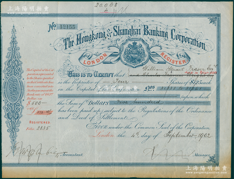 清代1902年英商香港上海汇丰银行股票,面额4股计银元500元,内有水印;这是迄今为止阳明所拍年份最早的汇丰银行老股票,且左边有英文红字(版式与上两次所拍者不同),珍罕,诚可遇而不可求也,八成新