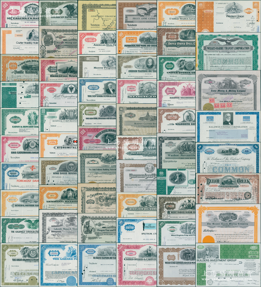 清代18xx年至1995年美国老股票藏品集一部4大册共500余种不同,内中涉及铁路、银行、航空、电力、石油、矿业、工业、制造、百货等诸多行业,且诸多均属世界500强等全球著名企业,其中包含45种八开大型债券,基本均雕刻版印刷,图案精美;海外名家出品,内中不乏稀少品种,能收集如此丰富者颇为难得,可适用于展览和馆藏,整体约八至九成新,敬请预览(注:因此项拍品品种繁多,难以细述,故特附有明细清单1份,内中包括英文和中文翻译名称、年份、面额等详尽介绍!)